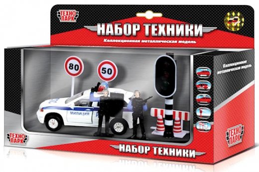 Игровой набор ТехноПарк "Милиция/Полиция" непременно понравится вашему ребенку. Набор включает в себя полицейскую (милицейскую) машину, две фигурки полицейских, светофор, два конуса, ограждение и два знака, ограничивающих скорость. Машинка выполнена из пластика и металла; двери и багажник открываются. При нажатии кнопки на крыше лампочки начинают светиться, при этом слышны звуки сирены.