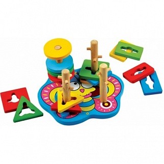 Сортировщик "Бабочка"- это головоломка для самых маленьких. Малыш должен насадить разные фигурки на палочки, продев их через специальные бороздки, или накрутив их по принципу гайки и шурупа. Игра представляет собой деревянное плоское основание, на котором нарисована веселая и забавная разноцветная бабочка. На ней вертикально установлены четыре деревянные палочки, на трех из которых есть определенное количество маленьких сучков, а на поверхности четвертой палочки вырезана спираль как на винтике. Так же в комплекте имеются фигурки разных цветов и форм. Отверстия в этих фигурках подходят под определенную палочку: некоторые фигурки накручиваются, другие насаживаются с помощью бороздок.