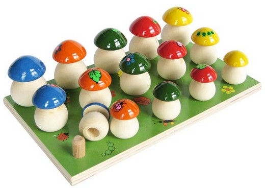 Самые маленькие могут просто одевать грибы на стержни. При этом тренируется координация глаза и руки, повышается подвижность пальцев. Дети постарше смогут с помощью грибов изучить понятия больше - меньше, научиться группировать предметы по различным признакам. Также грибы могут использоваться при обучении порядковому счету и решении простейших задач.