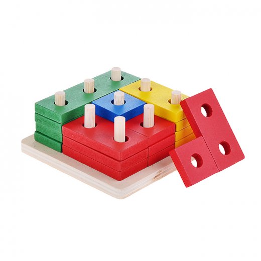 Логическая пирамидка "Квадрат цветной" - достаточно сложная, но оттого и интересная головоломка! На деревянном планшете находятся девять деревянных "гвоздиков", расположенных на одинаковом расстоянии друг от друга. На них надеваются разноцветные деревянные фигуры в форме уголков и прямоугольников с отверстиями для "гвоздиков", они располагаются в 4 ряда:, уголок в форме "Г" с тремя отверстиями, прямоугольники с двумя и тремя отверстиями и квадрат с одним отверстием. Нужно нанизать все фигуры на "гвоздики" определенным образом, чтобы в каждом ряду они лежали в форме квадрата (один ряд собрали в форме квадрата, затем второй ряд- в форме квадрата и т.д.)