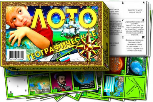 Лото географическое – прекрасный подарок ребёнку. На игровых полях ребята увидят изображения различных географических объектов и людей, которые необходимо будет закрыть карточками-вопросами. Ведущий берет карточки с вопросами и зачитывает их. Если кто-то из игроков правильно ответил и нашел на своей карточке картинку с ответом (номер картинки должен совпасть с номером карточки-вопроса), Ведущий отдает ему карточку-вопрос, а игрок накрывает ею картинку с ответом. Задача игроков быстрее других заполнить поля.