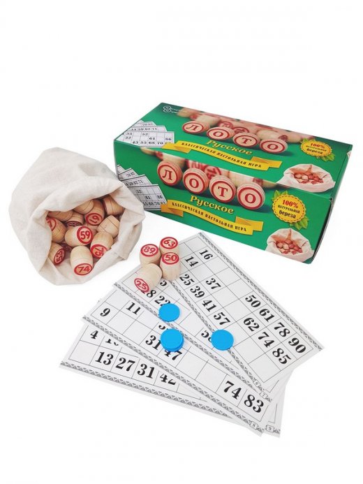 В игре используются 90 бочонков. На каждый бочонок с двух сторон нанесен его номер. Все бочонки кладутся в специальный непрозрачный мешок и перед началом игры тщательно в нём перемешиваются. Игровая карточка состоит из трёх строк, в каждой из которой 9 клеток, 5 из них занимают числа. Пустые клетки для игры не предназначены. Комплектация: