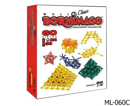 Магнитный конструктор Bornimago из серии Classic представляет собой классический вариант конструктора. Включает в себя цветные магнитные палочки одинаковой длины - 3см. и шарики диаметром 1,2 см. Палочки представляют собой магнитный стержень, чуть расширенный на концах, и залитый по бокам пластмассой желтого, зеленого, синего и красного цвета. Для соединения шарика и палочки достаточно просто поднести их друг к другу, и они смагнитятся, образовав довольно прочное соединение.