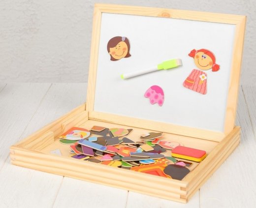 Магнитный конструктор Веселые фермеры – это увлекательная детская игра, состоящая из разноцветных элементов, мелков, маркера и вместительной деревянной коробки для удобной транспортировки. Одна сторона доски магнитная, на ней малыш может играть с картинками. Другая сторона — грифельная, на ней так здорово рисовать цветными мелками. Набор можно брать с собой в гости и в дорогу, ведь все элементы компактно складываются.