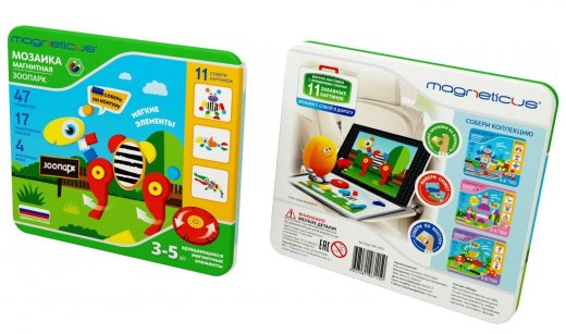 Состав набора: 47 мягких магнитных элементов, 3 вращающихся элемента, 4 красочных фона для сборки картинок, набор тематических наклеек, металлическая коробка, которая является игровым полем и местом для хранения мозаики.