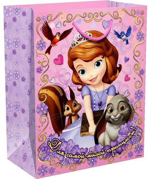 Специально для маленькой принцессы компания «Росмэн» предлагает подарочный пакет, созданный по мотивам диснеевского мультфильма «София Прекрасная». Изображение очаровательной Софии с ее друзьями лесными животными непременно понравится Вашей имениннице. Подарочный пакет выполнен из плотного картона и украшен ярким принтом с изображением главной героини популярного мультфильма «София Прекрасная».