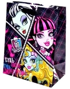Бумажные ламинированные пакеты - лидеры по популярности среди подарочной упаковки. Выполнен он в мягких и красочных тонах, с изображением героев из популярного мультфильма «Монстр Хай». Такой пакет несомненно понравится получателю. Благодаря качественной печати рисунок не сотрётся и не выгорит и к тому же он достаточно прочен, способен выдержать до 10 килограммов. Так что в дальнейшем его владелец может пользоваться им по прямому назначению, для походов в магазин и т.д.