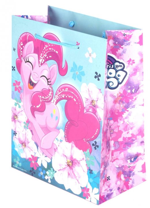 Пакет подарочный My little Pony – послужит как красивая упаковка под непосредственный подарок. Маленькая поклонница мультсериала будет просто в восторге! Подарочный пакет выглядит просто невероятно, он насыщенного розового цвета, боковая часть украшена цветочным принтом, очаровательные персонажи тоже окружены цветами, а вокруг них летают бабочки. Для удобства пакет оснащен специальными ручками.