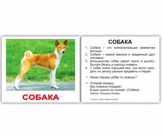 В комплект вошли животные: кошка, котёнок, собака, щенок, хомяк, шиншилла, морская свинка, скинни, дегу, корова, телёнок, лошадь, жеребёнок, курица, петух, цыплёнок, утка, утёнок, гусь, гусёнок, индюк, коза, козлёнок, овца, ягнёнок, кролик, крольчонок, осёл, ослёнок, пони, попугай, песчанка, черепаха, свинья, поросёнок, хорёк, игуана, альпака, ахатина, аквариумная рыбка.Обучение по карточкам даже по 5 минут в день стимулирует развитие различных отделов головного мозга, благодаря чему у ребёнка формируется фотографическая память, он развивается гораздо быстрее сверстников и с рождения открывает для себя мир энциклопедических знаний. Карточки, созданные по методике Глена Домана, будут способствовать развитию речи, пополнению словарного запаса, развитию цветового восприятия, интеллекта, мышления, памяти, скорости реакции.