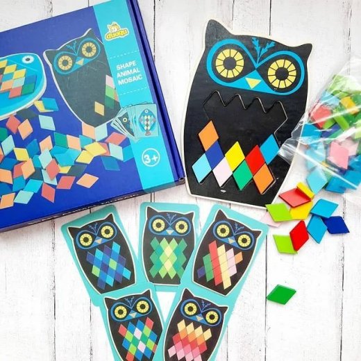 Деревянная мозаика станет увлекательной развивающей игрушкой для каждого малыша. В комплекте ребенок найдет основу в виде деревянной совы с пустым пространством в центре, а также множество разноцветных ромбиков, которыми он должен заполнить совенка согласно карточкам с заданиями. Ребенок может следовать инструкциям и примерам с заданиями или же заполнить сову так, как ему подскажет фантазия. Набор изготовлен из безопасных высококачественных материалов. Изображения покрыты безопасными красками.