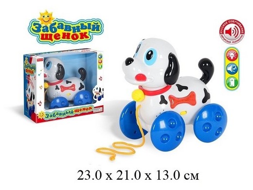 Каталка "Собачка музыкальная" настоящая игрушка-компаньон для любознательного и неутомимого малыша. Зверушка не только забавно движется в разных направлениях под веселую музыку, побуждая ребенка следовать за собой, она споет крохе веселую песенку, даря ему хорошее настроение и развивая чувство ритма. Во время движения собачка мотает головой и машет хвостиком, воздействуя на развитие цвето-визуального восприятия. Игрушка выполнена из ударопрочного экологичного пластика, безопасного для вашего малыша, не содержит острых и хрупких деталей. Кроме того, собачку можно катать за собой, как настоящую машинку! К игрушке прикреплен длинный шнурок, за который ребенок станет возить игрушку по дому.