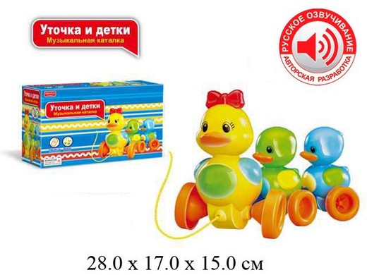 "Веселая уточка музыкальная" очень интересная и занимательная игрушка для вашего малыша. Пара пластиковых колес без труда преодолеет мелкие препятствия на дороге и будет сопровождать хозяина, куда бы он ни пошел. За очаровательной уточкой следуют пара симпатичных утят. Уточка не только забавно движется в разных направлениях под веселую музыку, побуждая ребенка следовать за собой, она споет крохе веселую песенку, даря ему хорошее настроение и развивая чувство ритма. Игрушка выполнена из ударопрочного экологичного пластика, безопасного для вашего малыша, не содержит острых и хрупких деталей. Кроме того, уточку можно катать за собой, как настоящую машинку! К игрушке прикреплен длинный шнурок, за который ребенок станет возить игрушку по дому.