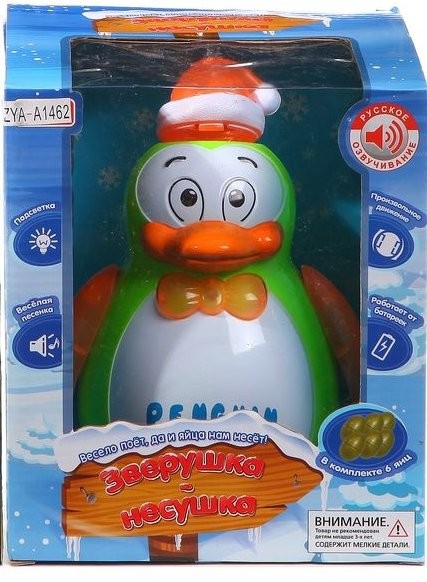 Милая зверушка-несушка, изображающая пингвина, привлекает своей яркой расцветкой и веселым дизайном. Она движется в произвольном направлении и своей походкой так напоминает настоящего пингвина! Пингвин может нести яйца, для этого нужно поместить пластмассовый элемент под колпачок птичке. Игрушка также поет песенку на русском языке и демонстрирует световые эффекты. При движении машет светящимися крыльями.