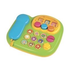 Интересный вариант стандартного стационарного телефона Музыкальный телефон Животные не оставит равнодушным Вашего малыша, заранее привлекая его внимание радужной окраской и крупными, разноцветными кнопочками, а также веселой музыкой с имитацией звуков животных.