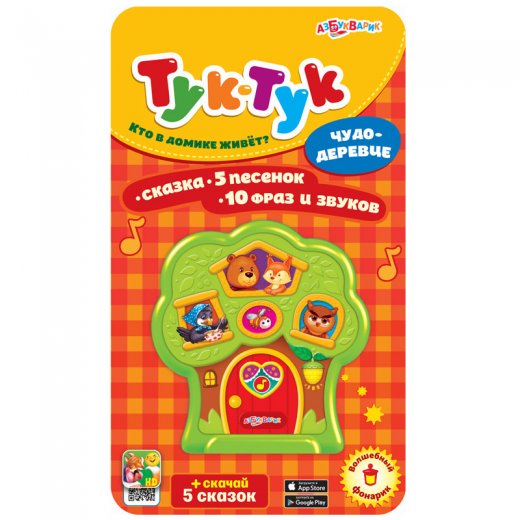 Музыкальная игрушка "Деревце" несомненно привлечет внимание малышей своим красочным внешним видом и оригинальным дизайном. Нажимая на кнопочку снова и снова, ребёнок послушает сказку «Три медведя», 5 любимых потешек ("Мишка косолапый", "Сидит белка на тележке", "Сорока-белобока", "Солнышко-колоколнышко", "Ах ты, совушка-сова") и познакомится с забавными зверюшками: мишкой, белочкой, сорокой, совой и пчёлкой.