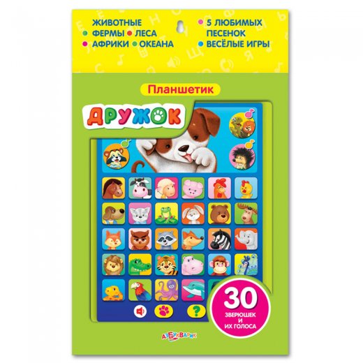 Планшетик "Дружок" выполнен из яркого пластика и стилизован под планшет. На экране расположены 35 кнопок выбора: 30 кнопок, оформленных изображениями животных фермы, леса, Африки и океана, а также 5 музыкальных кнопок. При нажатии на кнопки с животными малыш познакомится с их названиями и услышит голоса или характерные для них звуки.