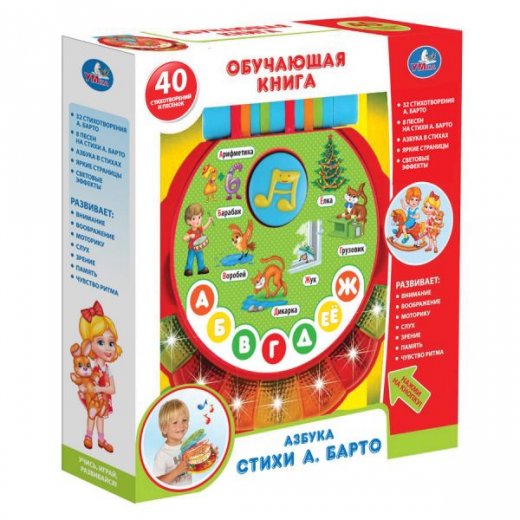Обучающая книга "Азбука А.Барто" станет отличным подарком для любознательного малыша. Обучающая игрушка выполнена в виде книги с круглыми пластиковыми страничками, на которых представлены буквы русского алфавита с прекрасными иллюстрациями к ним. На ее страничках расположены буквы русского алфавита и яркие иллюстрации, позволяющие быстрее освоить материал. Игрушка снабжена звуковыми и световыми эффектами. Во время обучения ребенок сможет прослушать 32 стихотворения и 8 песенок на стихи знаменитой детской писательницы Агнии Барто.