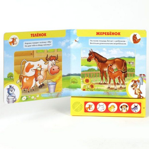 Озвученная книга «Чьи детишки?» — очень полезная книга для малышей. На десяти страницах этой книги напечатаны веселые стишки, много красочных иллюстраций. Но главное — книга доступно объясняет малышам, кто такие домашние животные и кто - их детеныши. Ваш маленький читатель сможет не только посмотреть рисунки, но и послушать голоса домашних животных. На каждой странице есть картинка, такая же, как на кнопке внизу книги. Если нажать на кнопку, то зазвучит голос: теленка, козленка, щенка, ослика или цыпленка. Дети постарше смогут прочесть книгу самостоятельно и выучить стишки с ее страниц.