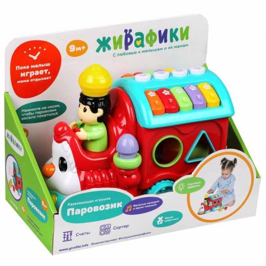 Паровозик-сортер, с музыкой, фирмы Жирафики, для самых маленьких. Чудесный паровозик выполнен в ярких цветах, у него доброе выражение лица. Он издает звуки и мелодии, сможет развеселить любого ребенка. Труба светится, можно сортировать детальки в отверстия, заодно перевозить их с места на место. В виде игры ребенок развивается и обучается. На крыше паровозика есть функциональные кнопочки, нажимая которые малыш послушает различные мелодии и голоса животных! Там же расположены красочные счёты, состоящие из 5-ти бусин. С их помощью можно познакомить малыша с первыми азами счёта. Ребенок не будет уставать, от занятий, потому что с паровозиком не только полезно учиться но и весело играть! Прекрасная развивающая игрушка, для обучения и веселых игр.