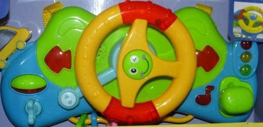 Игрушка на батарейках "Руль" представляет собой панель с рулем, рычагом переключения скоростей и цветными кнопками. Игрушка со световыми и звуковыми эффектами, звук мотора, ключ зажигания, поворотники; три разных скорости - три разных звука. При нажатии на кнопку светофора - она загорается и произносит название цвета, при нажатии на кнопку - ноту играет музыка. Маленький руль крутится. Игрушка на батарейках "Руль" изготовлен из нетоксичного, безопасного для детей материала, не вызывает аллергических реакций.