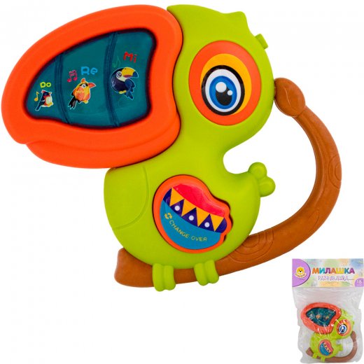 Погремушка выполнена в виде забавного тукана. На игрушке расположены яркие кнопочки. Малыши с интересом будут их нажимать и слушать веселые мелодии. Игрушка выполнена из безопасного, качественного пластика.