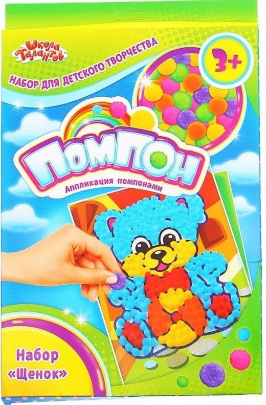 Набор для детского творчества позволит ребенку самостоятельно создавать забавные аппликации из маленьких помпонов.