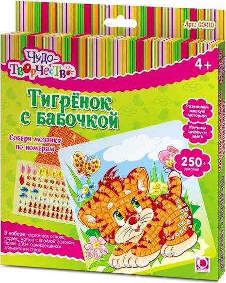 Из набора самоклеящейся мозаики «Чудо-творчество» можно сделать красивую яркую картинку с тигренком и бабочкой. Эту мозаику нужно клеить по номерам: на обратной стороне каждого элемента есть номер, который показывает, куда деталь нужно приклеить. Номера на элементах совпадают с номерами клеточек на картонной основе. В итоге получится объемная, красочная и блестящая поделка, радующая глаз.
