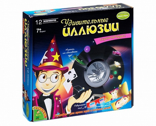 В набор входят 12 экспериментов для сочетания определенных цветов, форм и рисунков. Иллюзии возникают за счет искажения изображений с помощью зеркал и света. Ваш малыш почувствует себя настоящим волшебником, удивляя вас и своих друзей необычными опытами.