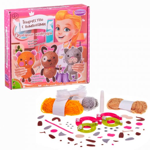 Впервые получив серьёзное распространение во Франции, помпоны продолжают своё победное шествие по миру. Если раньше их использовали в качестве украшений одежды или военных знаков отличия, то сегодня им находят применение в самых разных сферах, например при воспитании и обучении детей. Из помпонов довольно легко изготовить яркую игрушку, а дальше её можно использовать как в образовательном процессе, так и для игры. Когда интерес к игрушке пропадёт, она станет отличным украшением детской комнаты. BONDIBON предлагает вам прикоснуться к этому удивительному миру с помощью серии Творчество с помпонами. В составе набора есть все необходимое: пластиковые зажимы для создания помпонов двух размеров, разноцветная пряжа, элементы украшения и инструкция с секретами мастерства.