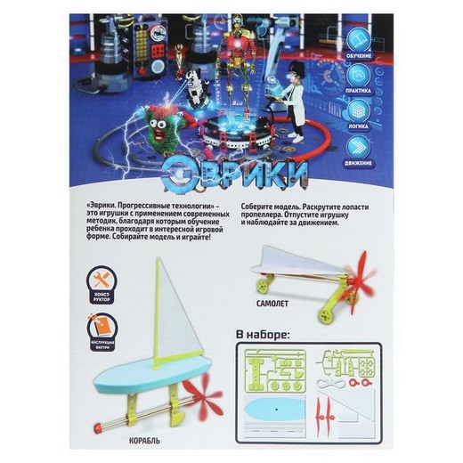 Запускайте самолёт на открытом воздухе, а кораблик в ванной или неглубоком водоёме. Раскручивайте лопасти пропеллера и наблюдайте в действии третий закон Ньютона.Состав набора: