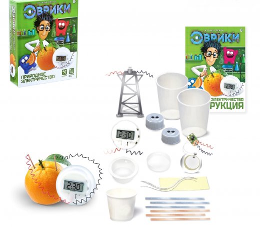 Набор включает в себя элементы конструктора, с помощью которых ребёнок сможет сделать батарейку для часов из картошки, получить из земли энергию для усиления звука, зажечь лампочку от воды и заставить звуковой чип работать от уксуса. Увлекательные эксперименты подарят маленькому учёному яркие впечатления и незабываемые эмоции. Соединяйте провода с цинковыми пластинами, помещайте их в картофель, землю или бутылку с водой и наблюдайте за происходящим.