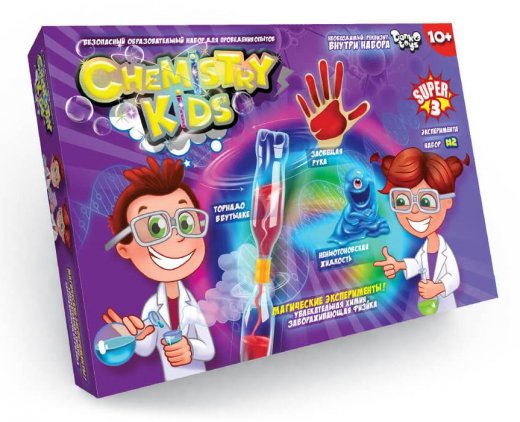 Мы привыкли смотреть на мир вокруг себя, получая информацию, которую видят наши глаза, слышат уши, что-то пробуя на ощупь. А как все устроено на самом деле? Данный набор не только познакомит вас с различными видами увлекательных химических экспериментов и физических явлений, завораживающих своими эффектами, но и объяснит их суть. А поможет Вам в этом подробная инструкция и необходимый реквизит, который находится внутри коробки. И кто знает, может быть именно Вы совершите удивительное научное открытие, а увлечение наукой начнется с набора «Chemistry Kids»!