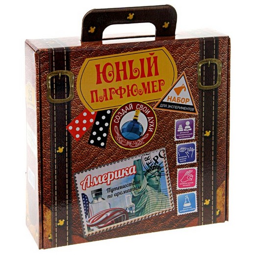 Юный парфюмер "Америка" - познакомит юного исследователя с азами парфюмерного искусства. Ваш малыш узнает, как правильно смешивать благоухающие компоненты и как сохранять созданные шедевры парфюмерии на длительный срок. Путешествие по ароматам Америки не только расскажут о парфюмерии разных стран мира, но и помогут самостоятельно создать эксклюзивные ароматы духов. В каждом из наборов серии, который позволит изготовить до 25 различных ароматов, вы будете открывать для себя что-то новое в удивительном мире парфюмерии. Специальный чемоданчик, в который убраны все необходимые ингредиенты и инструменты для создания собственных духов, отлично подходит для хранения и переноски мини-лаборатории юного парфюмера.