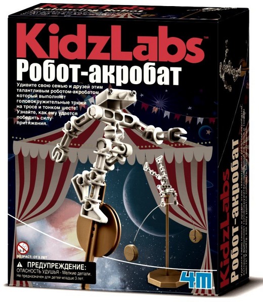 "Робот-акробат 4М" - поможет юному исследователю создать забавного робота-акробата, который удивит всех окружающих! Он будет исполнять удивительные трюки на тросе и тоненьком шесте. Вооружайтесь отверткой, и вперед, навстречу изумительным открытиям! В помощь прилагается иллюстрированная инструкция с подробным планом сборки. В ней вы найдете познавательные факты о гравитации, объясняющие мастерство робота-акробата и феномен Пизанской башни.