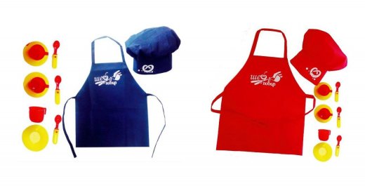 Состав набора: Фартук, колпак, 3 чашки, 3 блюдца, 3 ложки.