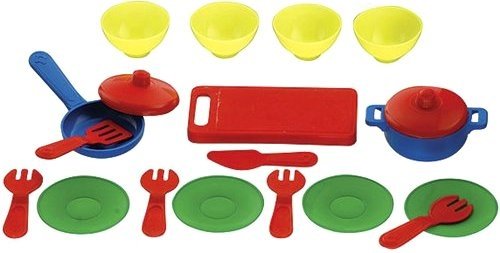 Игрушечная еда, приготовленная в такой яркой посуде, обязательно вызовет у гостей аппетит. Посуда изготовлена из пластика ярких насыщенных цветов. Все элементы набора весьма похожи на настоящую посуду, что лишь добавляет игрушкам привлекательности.