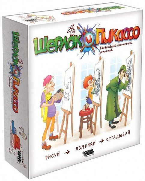 Настольная игра Шерлок и Пикассо- это прекрасная игра для 3-6 игроков, которая отлично развивает фантазию, дедукцию и, конечно, навыки рисования. Игроки становятся детективами, которые отгадывают нарисованное; художниками, которые пытаются изобразить различные загаданные предметы; и сорванцами, цель которых – запутать детективов и помешать им правильно отгадывать слова. Для этого сорванцы дополняют рисунок новыми элементами так, чтобы максимально скрыть изначальный замысел художника. При этом на всё про всё у каждой роли есть всего 40 секунд, поэтому нужно быть не только сообразительным, но и быстрым!