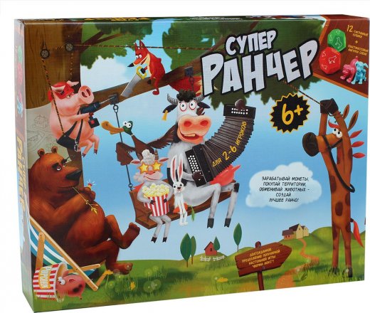 Настольная игра "Супер ранчер" - это долгожданное продолжение популярной настольной игры "Ферма Люкс". Разводить и обменивать животных теперь еще увлекательнее! Для победы нужно собрать хотя бы по одному виду всех животных, а это не так просто, как может показаться! Вам предстоит зарабатывать монеты, покупать территории и проявить стратегическое мышление, ведь чем ближе Ваши животные к лесу, тем больше вероятность, что их съедят лиса или медведь! Защититься от хищников Вам помогут только верные сторожевые собаки! Зарабатывай и покупай, обменивай и расселяй – делай все, чтобы создать лучшее ранчо и победить!