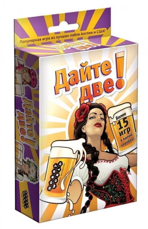 Дайте две – это компактный сборник простых и азартных игр для пивных вечеринок дома и в пабе. В коробочке можно найти игру на любой вкус: от командной, до индивидуальной игры. Игры на ставки, игры на выбывание, и всё одной колодой. Рискуйте или осторожничайте, но главное помните, что проигравший проставляет выпивку!