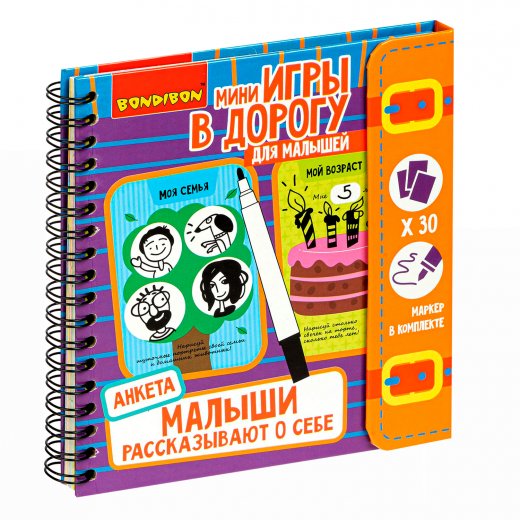 Мини-игры в дорогу "МАЛЫШИ РАССКАЗЫВАЮТ О СЕБЕ" от ТМ Bondibon - это увлекательная книжка-анкета с различными забавными вопросами, ответы на которые в основном нужно рисовать! Многоразовые ламинированные страницы и легко стирающийся маркер позволят малышу фантазировать сколько угодно, а родители смогут фиксировать ответы в разные периоды его жизни, о чем в будущем будет интересно вспомнить вместе!