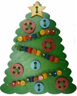 В набор входит основа в форме елочки, разноцветные игрушки (бусинки, пуговицы и звезда) и шнурок, которым эти детальки нужно пришнуровать к основе. Все игрушки окрашены в разные цвета (красный, желтый, синий, голубой, оранжевый, зеленый), а пуговицы имеют различный диаметр и разное количество дырочек (2 или 4).