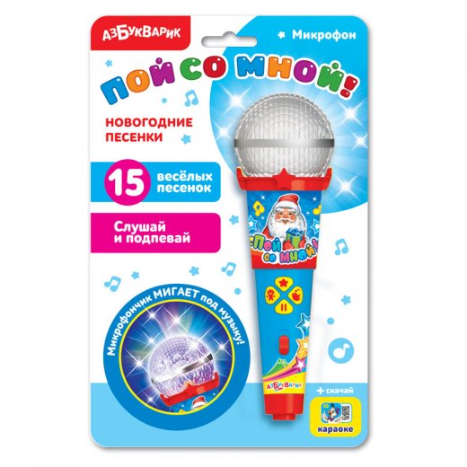 Слушай 15 детских хитов ("Песенка Умки"; "Белые снежинки"; "Что такое Новый Год?"; "Зимы я вовсе не боюсь"; "Песня Деда Мороза"; "Расскажи, Снегурочка"; "Зима"; "Кто снежинки научил танцевать?"; "Снеговик"; "Почему медведь зимой спит"; "Кабы не было зимы..."; "В лесу родилась ёлочка"; "Рождественская песенка"; "Новогодние игрушки"; "Песенка о ёлочке"), танцуй и подпевай любимым героям. Весёлое пение с микрофоном раскроет музыкальные и актёрские таланты малыша. А мобильное приложение от Азбукварика подарит ещё больше веселья!