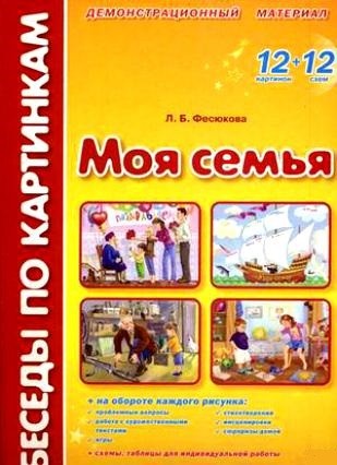 Беседы по картинкам Моя семья – это замечательный и познавательно – воспитательный подарок для ребенка. В данном наборе представлено авторское пособие по этике для работы с детьми дошкольного возраста. Предложенное учебное пособие содержит 12 цветных картинок и 12 схематических заданий с изображением ситуаций, которые помогут объяснить ребенку родственные связи и взаимоотношения. На примере подробно развёрнутых занятий раскрываются основные правила общения людей, нормы поведения, которые необходимо соблюдать и выполнять в семье. В наборе представлены различные ситуации в семье и хорошие, и плохие – чтобы ребенок имел возможность рассуждать и анализировать.