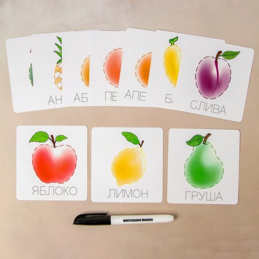 Обводите картинки и их названия на многоразовых карточках маркером, стирайте с помощью сухой салфетки, вложенной в набор.