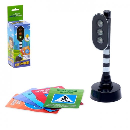 Расставьте машинки малыша на импровизированной дороге и представьте, что находитесь в переполненном машинами городе. Необходимо отрегулировать движение, в этом поможет светофор. Ребёнок с интересом будет нажимать на кнопку, менять цвета сигналов и по очереди пропускать технику. В комплект входят 5 обучающих карточек с заданиями, которые объяснят значения дорожных знаков.