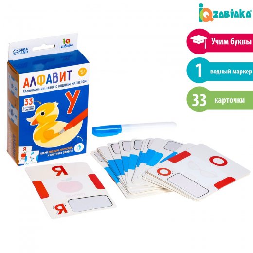 В наборе 33 карточки с буквами и водный маркер.