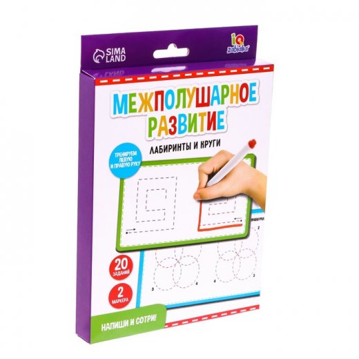 С набором пиши-стирай «Межполушарное развитие» ребёнок научится рисовать двумя руками одновременно. Игра способствует развитию обоих полушарий мозга в равной степени.