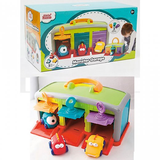 Когда монстрики устают от гонок и путешествий, они отдыхают в домике-гараж. У каждой машинки – отдельный гараж, который открывается ключиком. Для того, чтобы открыть домик, малышу нужно решить задачку - подобрать ключики к дверкам, правильно сопоставив цвет ключиков и дверок, а также форму ключика с формой скважины для него. Когда все дверки открыты, можно выпустить монстриков из домика –для этого нужно нажать рычажок на задней стороне гаража, и машинки весело выкатятся из бокса Игрушку можно использовать как кейс для хранения монстриков, его удобно переносить и брать с собой на прогулку благодаря удобной ручке.