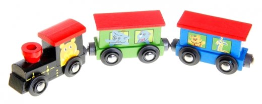 "Мы едем - едем - едем в далекие края, хорошие соседи, счастливые друзья" - так и хочется запеть эту веселую песенку, глядя на этот поезд. Поезд деревянный, на магнитах. Состоит из паровозика с машинистом и трех вагонов, один из которых пассажирский, а два других - товарные. Из окон пассажирского вагона весело машут и смеются звери. Они отправляются в далекие края. В товарные вагоны можно складывать "груз". Можно переставлять вагоны местами.