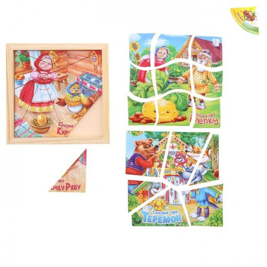 Пазл разрезной «Сказки» – замечательная игрушка. Задача ребёнка – собрать не только части каждого пазла, но и сложить слоями все картинки в правильной последовательности. В нём 3 изображения фрагментов известных сказок. Каждая картинка складывается из разного количества элементов. Самая простая картинка состоит из 6 частей, самая сложная - из 9 частей. Фрагменты имеют простую вырубку, поэтому с этой головоломкой справится даже кроха.